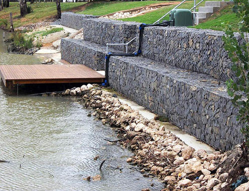 4、鋅-5%、鋁-混合稀土合金鋼絲包塑:在鋅-5%鋁-混合稀土合金鋼絲的表面包一層PVC或PE保護(hù)層,然后編織成各種規(guī)格的格賓石籠網(wǎng)。這層保護(hù)層將大大增加對高污染環(huán)境的保護(hù),并通過無色選擇與周圍環(huán)境相結(jié)合。